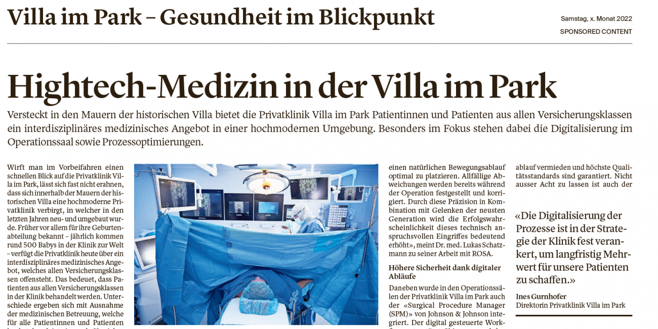 Versteckt in den Mauern der historischen Villa bietet die Privatklinik Villa im Park Patientinnen und Patienten aus allen Versicherungsklassen ein interdisziplinäres medizinisches Angebot in einer hochmodernen Umgebung. Besonders im Fokus stehen dabei die Digitalisierung im Operationssaal sowie Prozessoptimierungen.