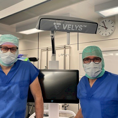 VELYS™ Robotic-Assisted Solutions (VRAS) helps the surgical team to implant knee prostheses as accurately as possible: at the start of the operation, data is collected that the robot uses to determine the exact size, range of motion and stability of the knee joint. During the operation, the robot enables the surgeon to make very precise bone cuts based on the data generated, as well as to simulate and adjust the function of the knee prosthesis on the computer. The implantation is only carried out after the robot has simulated ideal stability and functionality of the knee prosthesis.
