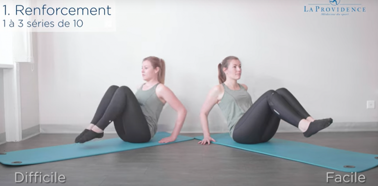 Renforcement : Contracter les abdominaux et ne cambrez pas le dos lors de la réalisation de l’exercice.