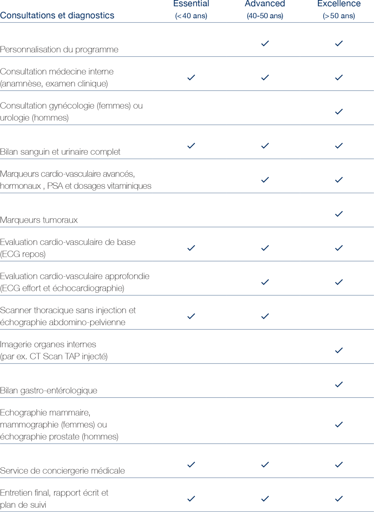 Le coût d’un check-up individuel commence à 2'500 CHF*, en fonction des examens inclus et de vos besoins spécifiques. Pour les entreprises, nous proposons des check-up à partir de 1'000 CHF, adaptés aux groupes et conçus pour promouvoir la santé des collaborateurs. Les tarifs peuvent varier selon la clinique choisie. Nous vous invitons à contacter directement nos équipes pour obtenir un devis détaillé et personnalisé.