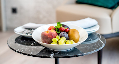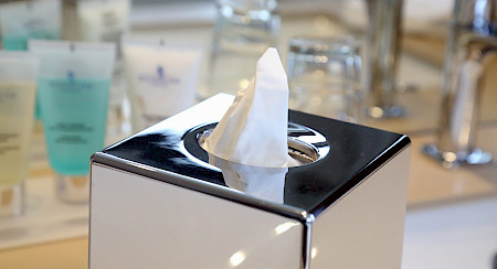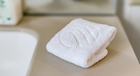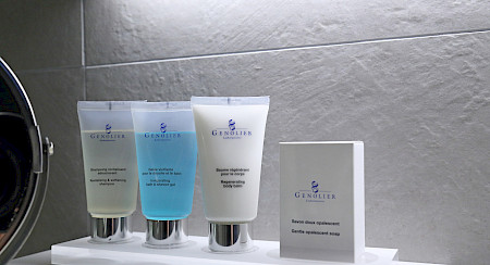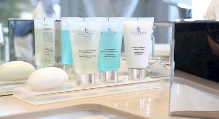Les produits d’accueil proviennent uniquement des Laboratoires Genolier et sont à placer sur le lavabo de la salle de bain ou sur le meuble situé à côté, selon la place à disposition.