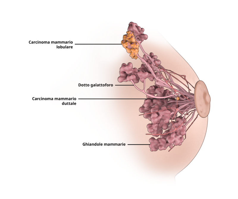 Nel caso del carcinoma mammario, occorre distinguere tra carcinoma mammario invasivo (duttale) di tipo aspecifico (il tumore proviene dai dotti galattofori) e carcinoma mammario lobulare invasivo (il tumore proviene dai lobuli ghiandolari). Vi sono inoltre alcune forme più rare di cancro al seno, ad esempio il carcinoma mammario infiammatorio, un cancro al senso associato a una reazione infiammatoria visibile all’esterno.
