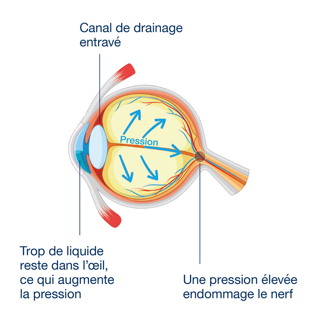 Chez les patients atteints de glaucome, l'écoulement normal de l'humeur aqueuse (liquide contenu dans l'œil) est entravé, ce qui provoque une accumulation de liquide et une augmentation de la pression intraoculaire. Lorsque cette pression devient trop élevée, le nerf optique est progressivement endommagé.